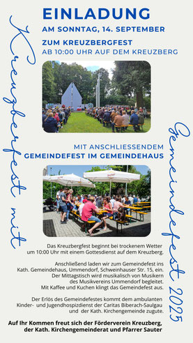 Am Sonntag, den 14. September 25 findet das Kreuzbergfest und anschließend das Gemeindefest der Kath.